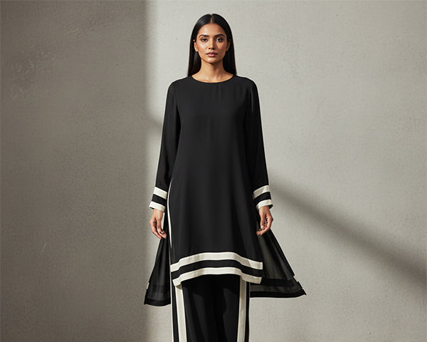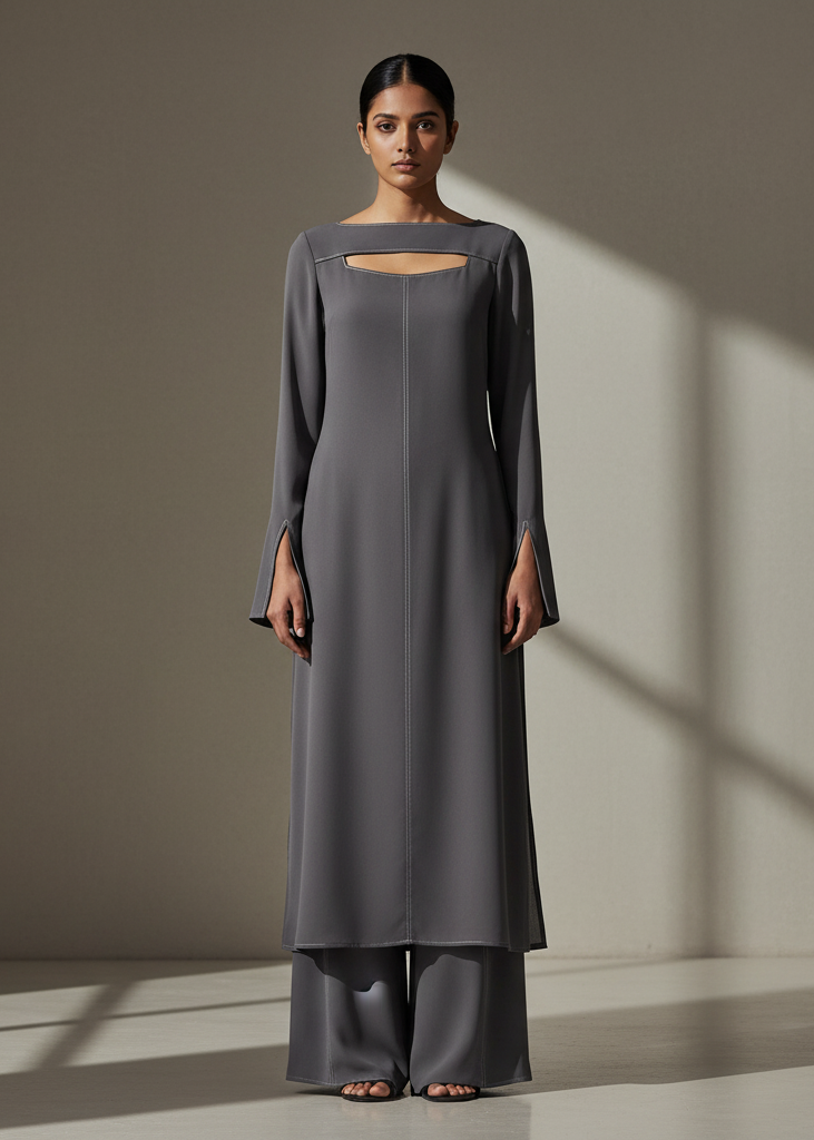 A deep charcoal-grey column-style georgette co-ord with a sharp, modern silhouette. The top is a...