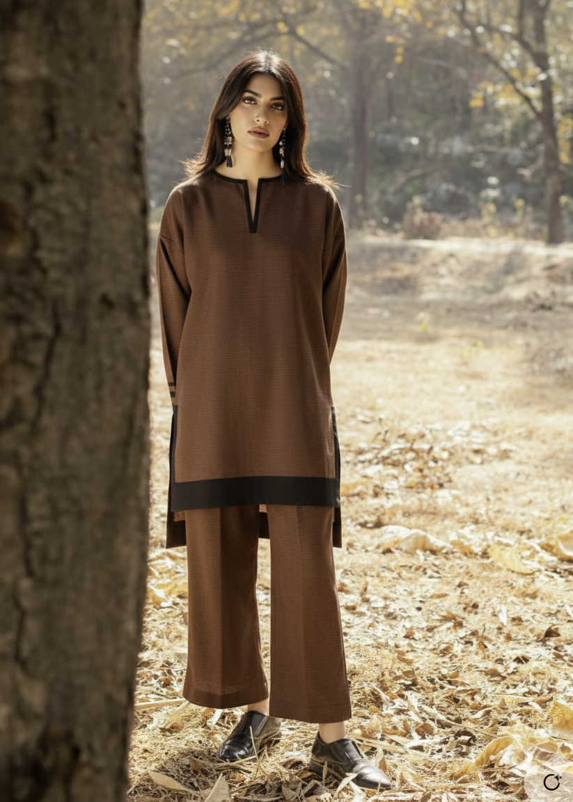 A refined two-piece co-ord set featuring a straight-cut, long tunic in rich, warm cocoa brown...