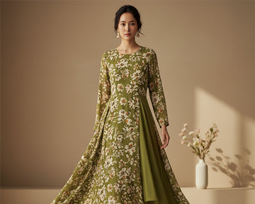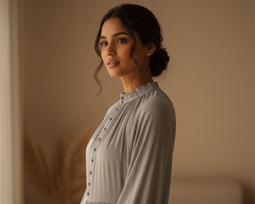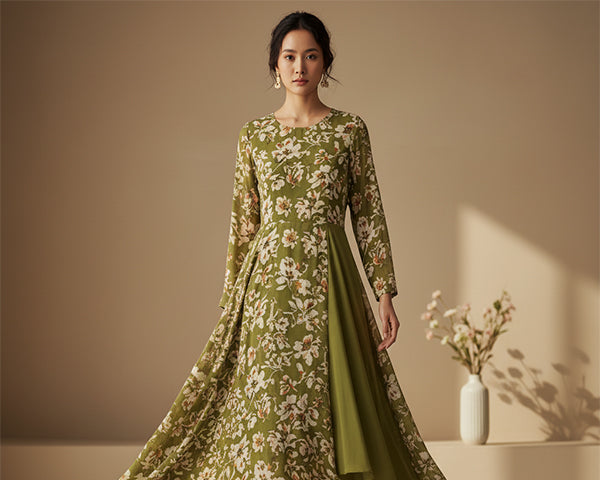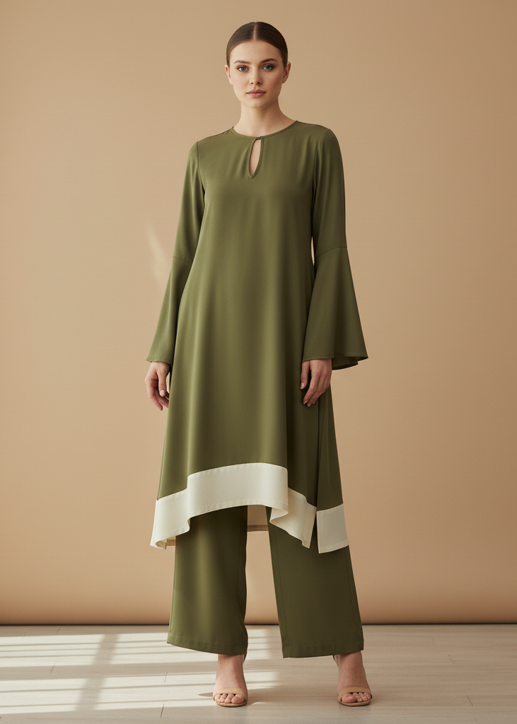 An understated olive green co-ord set featuring a keyhole neckline and flared full sleeves. The...