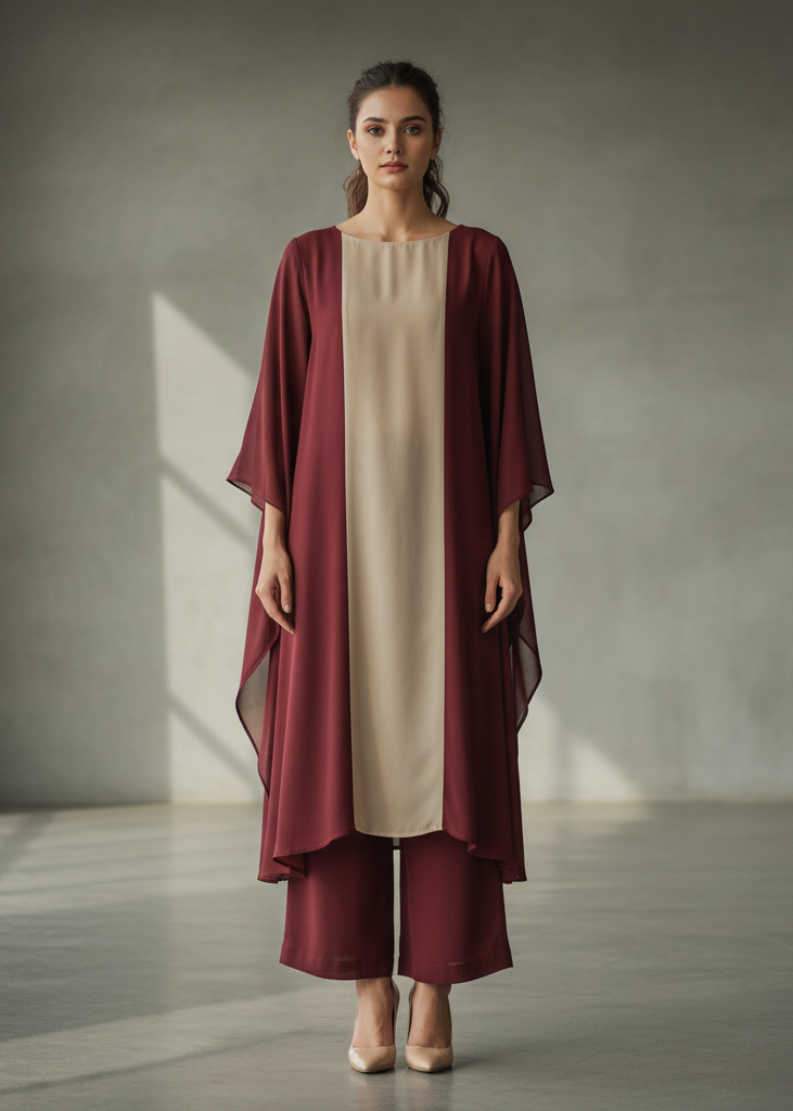 A rich maroon and beige color-block tunic set with a boat neckline and wide straight...