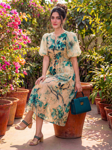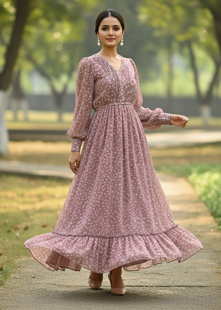A fluid maxi georgette gown designed with a soft gathered high neck, gentle lantern sleeves,...