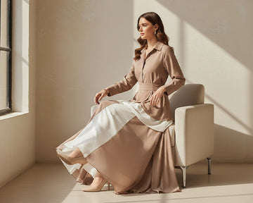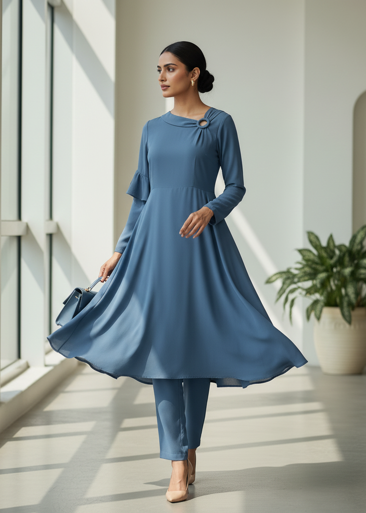 A refined, sculpted co-ord in soft sand-beige georgette, designed with architectural layering and fluid movement....