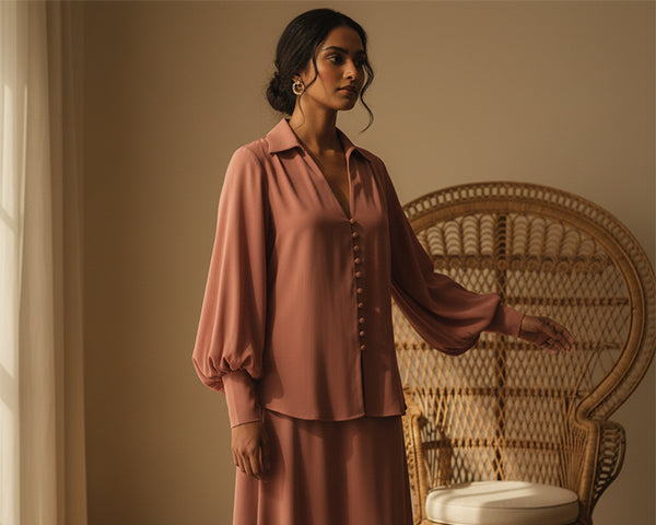 A chic 2-piece georgette co-ord in a muted rose-clay tone. The top features a collared...