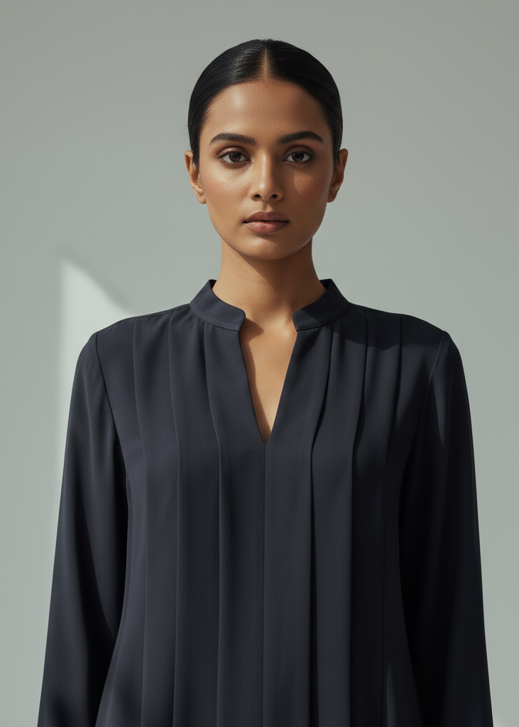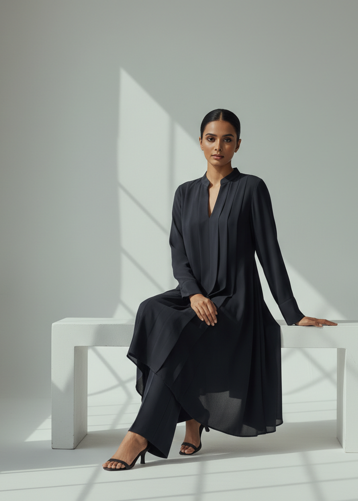 A midnight-ink panel-cut georgette co-ord designed with crisp, architectural precision while keeping the flow of georgette intact.