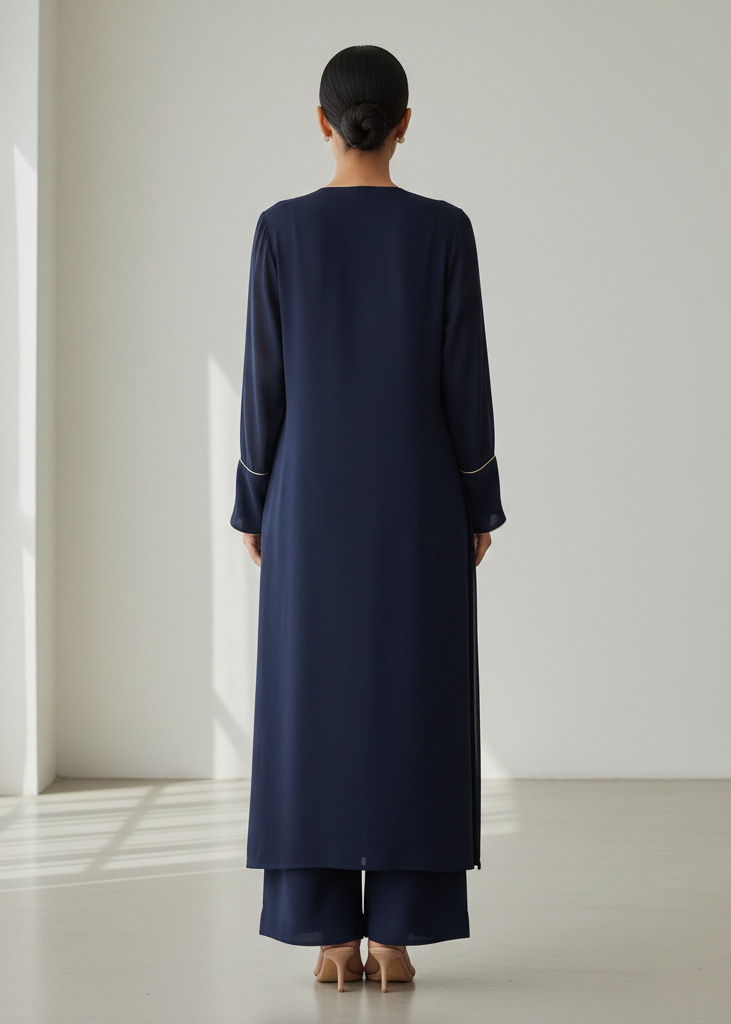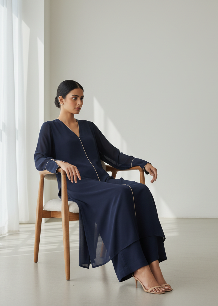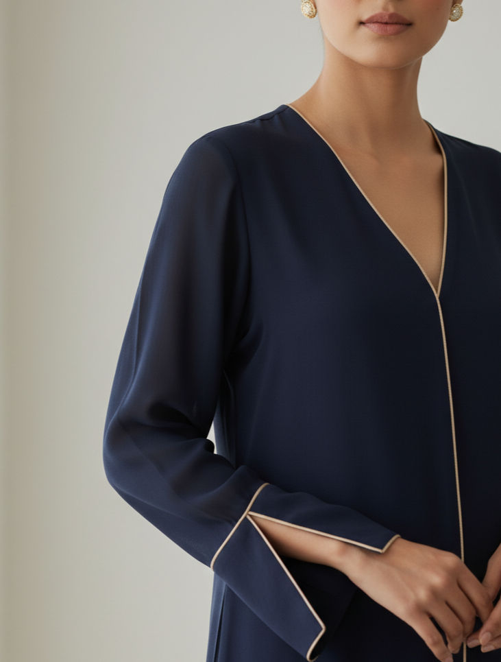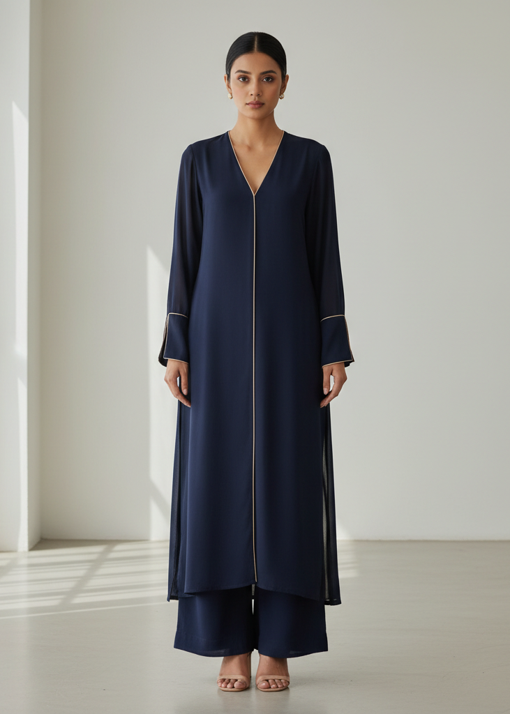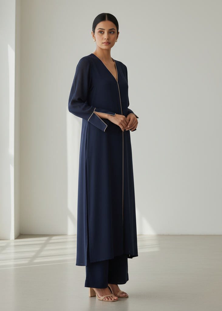 A striking navy co-ord set with a V-neckline and slit-cuff sleeves, outlined by a thin beige piping along the neckline and cuffs. The tunic is long and straight with a tailored edge, paired with matching wide trousers for a polished monochrome mood.