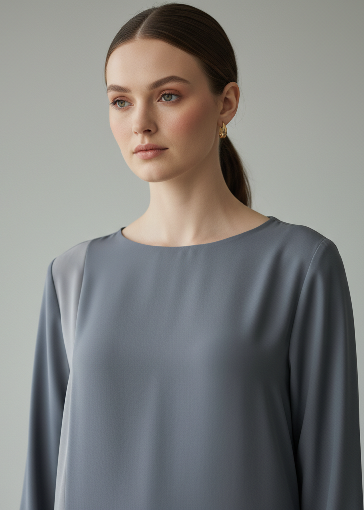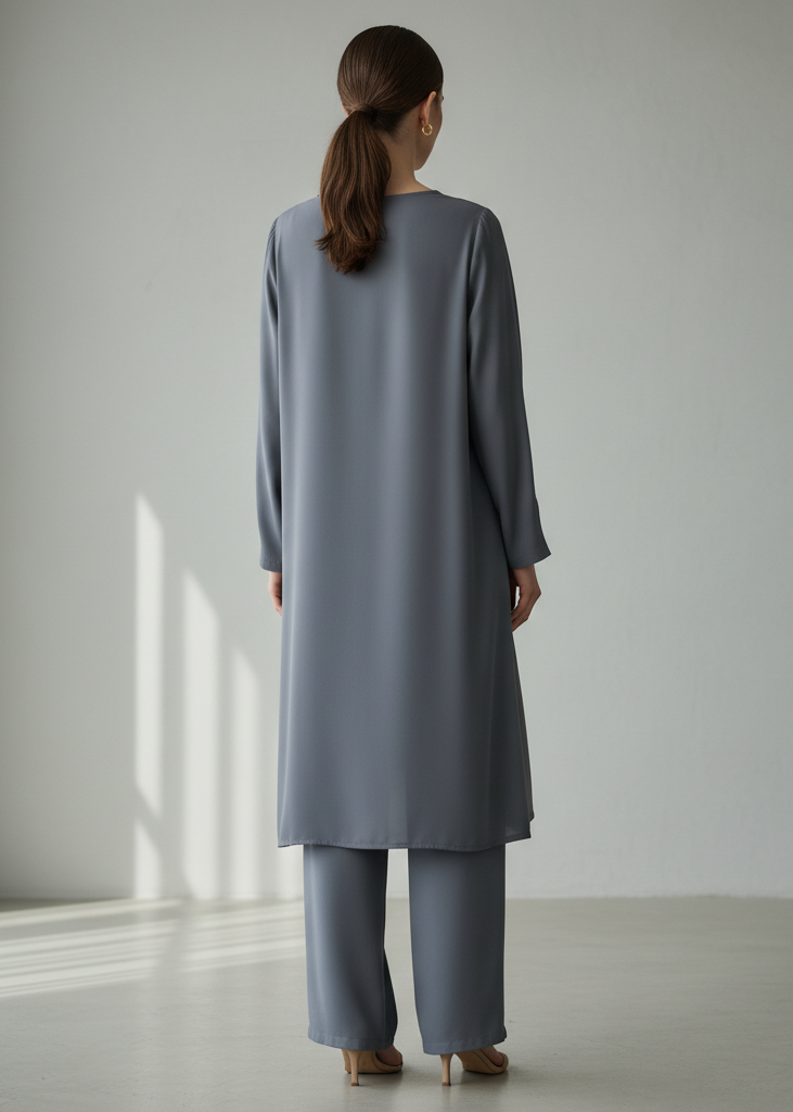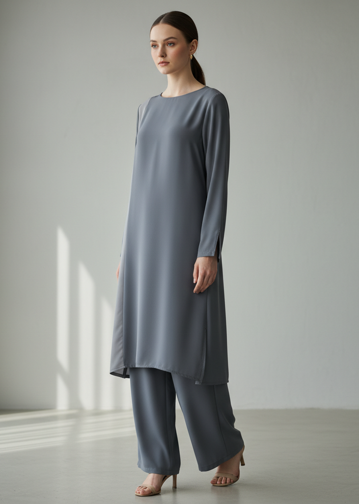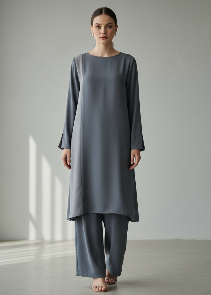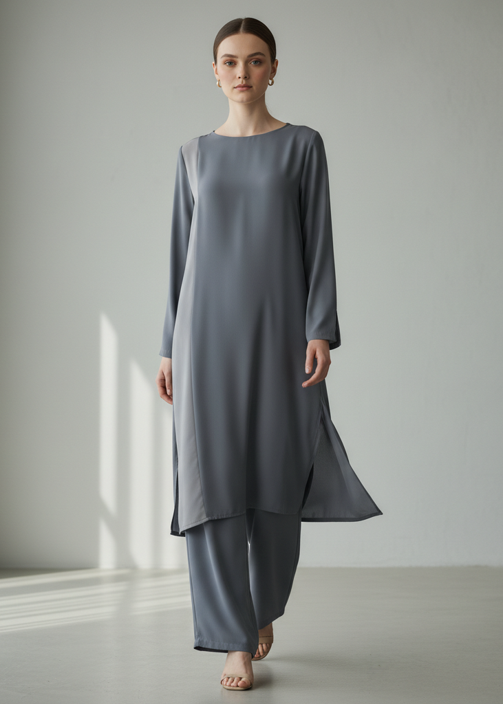 A relaxed straight-cut co-ord in cool slate grey paired with a soft ash panel running down one side. Designed with a boat neckline and slit-cuff long sleeves, it blends structure and ease. The trousers are wide-leg with a fluid drape, balancing the tunic’s clean lines.