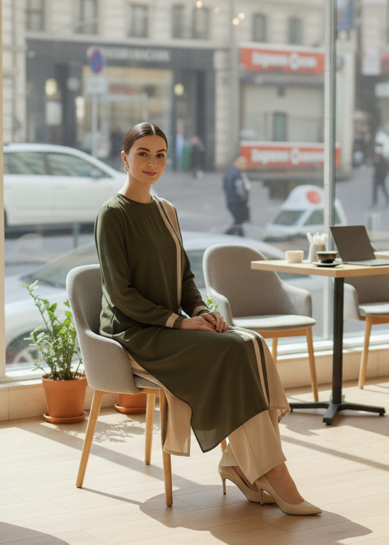 A refined two-piece co-ord set featuring a straight-cut, long tunic in rich, warm cocoa brown layered over cropped wide-leg trousers. The tunic is styled with a minimalist V-slit neckline and defined by a solid black border tracing the hem and extending as subtle accents at side vents. Signature clean lines, fluid drape, and a matte finish highlight the sophistication in every detail. Crafted in midweight woven cotton blend for ultimate comfort and poise.