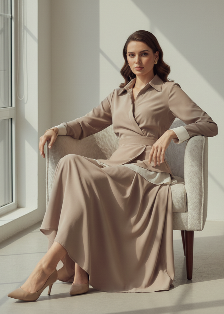 A modern, polished ensemble perfect for elevated daywear, soft formal occasions, and contemporary modest dressing.