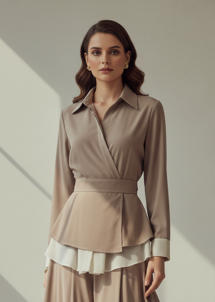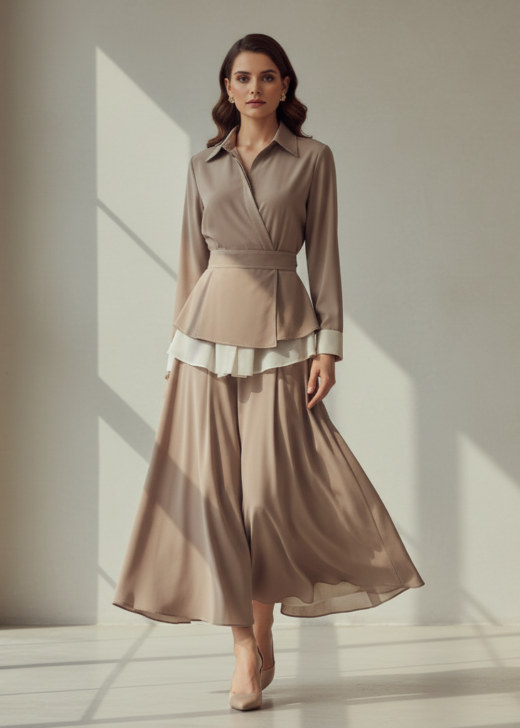 The top features a wrap-style bodice with a sharp shirt collar, cinched at the waist with a clean structured belt. A double-layered hem—contrast ivory georgette peeking beneath the sand tone—adds depth and quiet luxury.