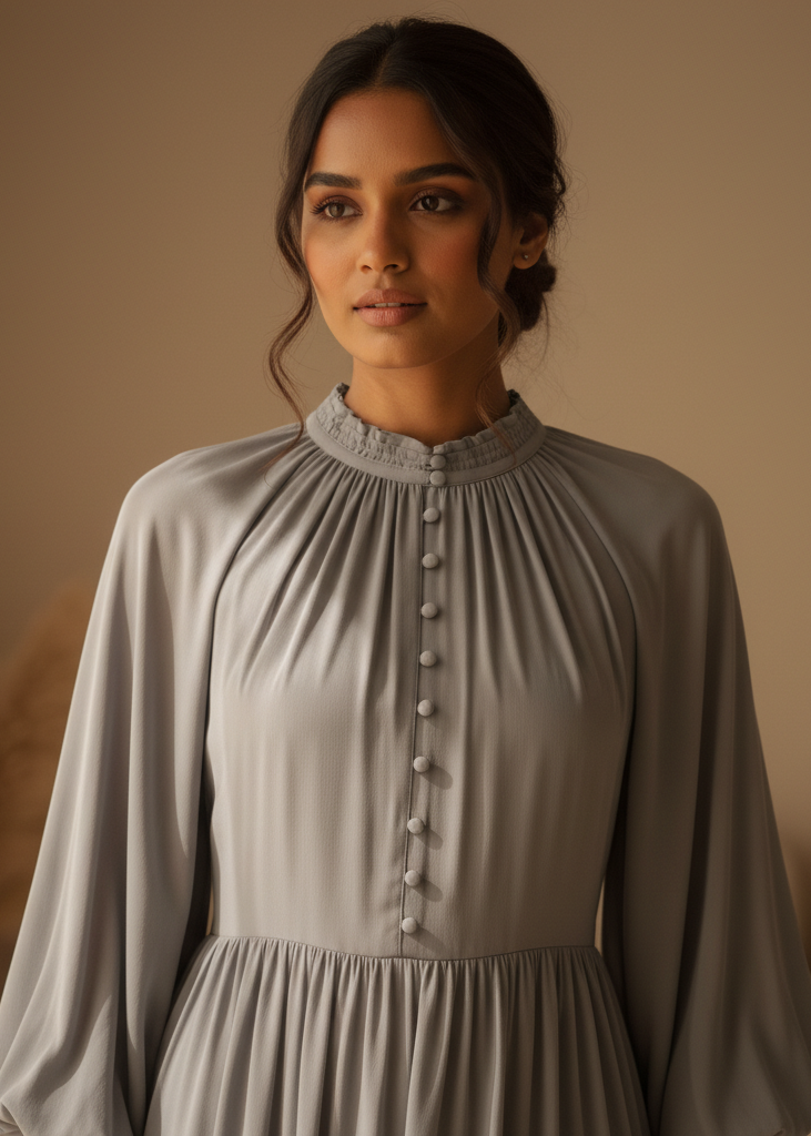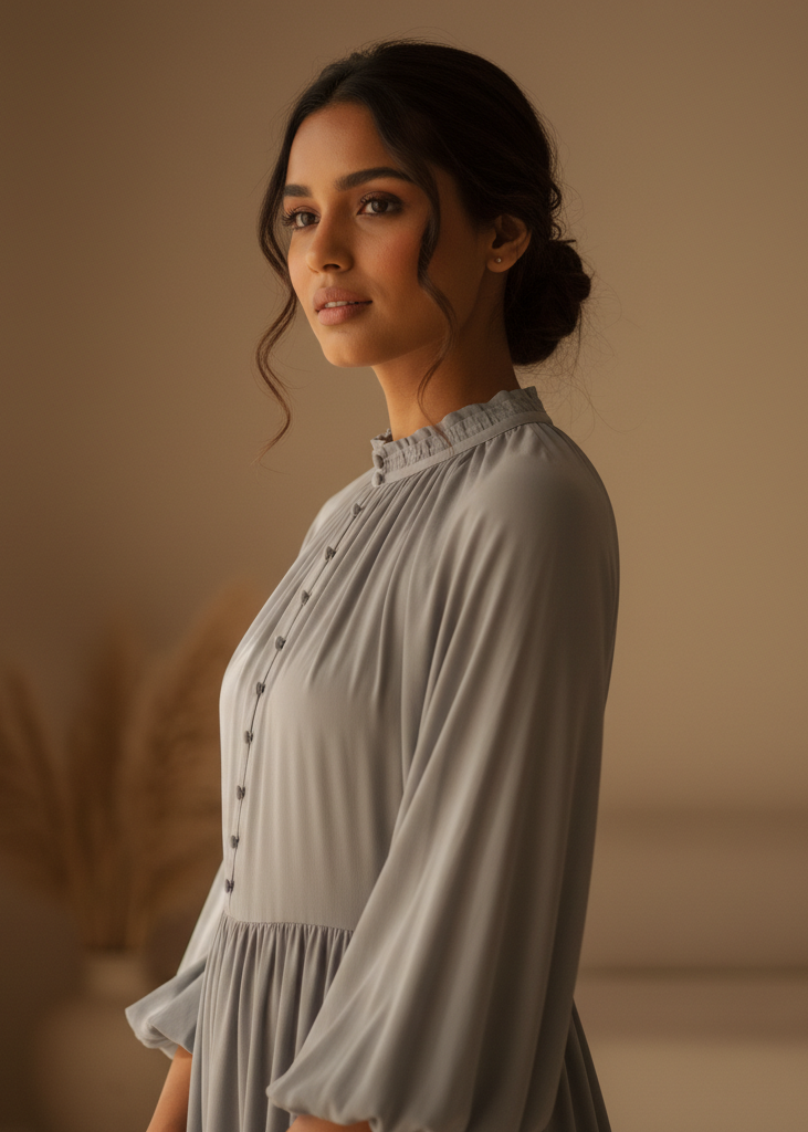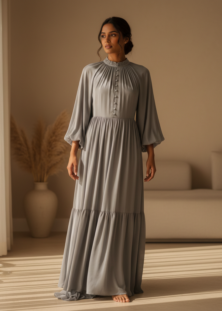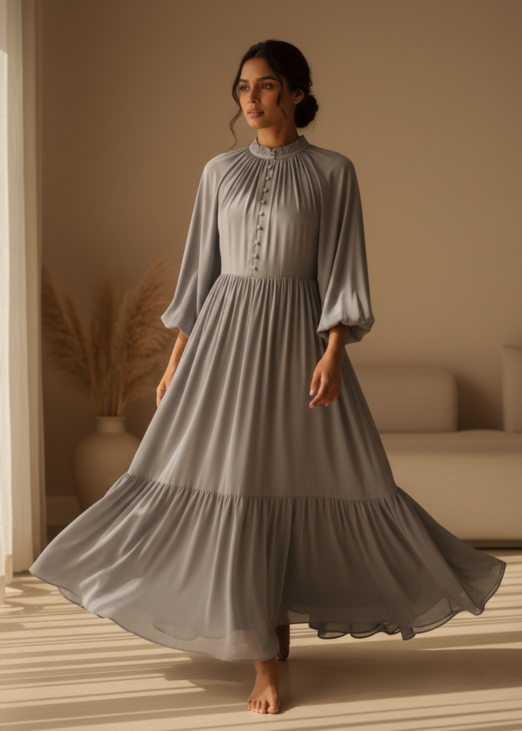 A fluid maxi georgette gown designed with a soft gathered high neck, gentle lantern sleeves, and a slightly tiered full skirt that creates natural volume without heaviness. A minimal line of covered buttons accents the upper bodice, adding sophistication. Rendered in a mist-silver gray tone, the gown drapes with calm elegance.